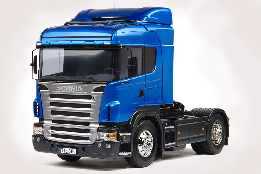 "LAS JOYAS DE LA CORONA". MAQUETA PARA MONTAR Scania R470 (2005) de la marca japonesa Tamiya. Maqueta para montar a escala 1/14 con una longitud de 452mm en aluminio y plástico. Con motor eléctrico y cambio de marchas mediante transmisor y juego de luces.