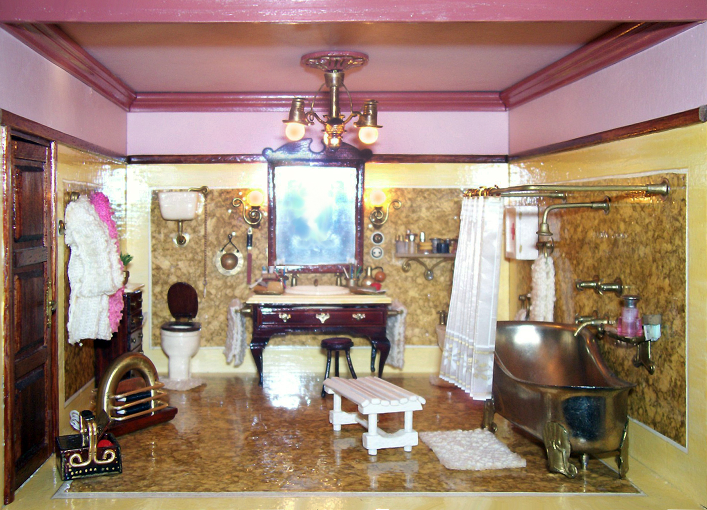 BAÑO. Lavabo, inodoro, bidé, repisa, mueble auxiliar, botiquín, estufa eléctrica, zapatero, banco, baño y diversos accesorios, entre ellos una bacía y un afilador de navajas.