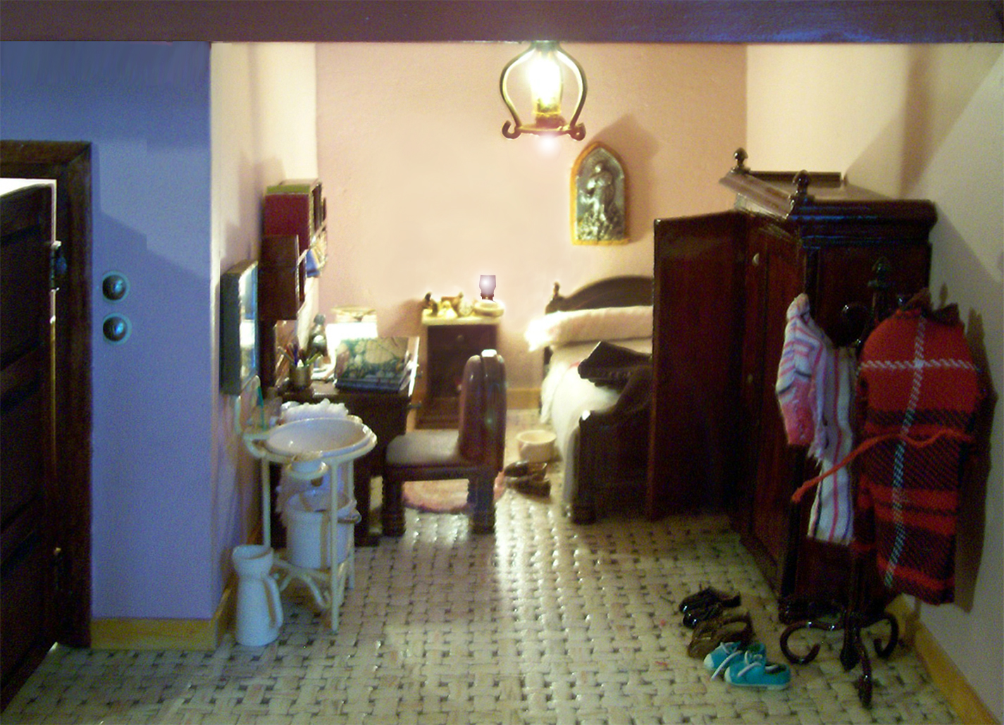 DORMITORIO. Cama pequeña, mesita, armario, escritorio, palanganero, perchero, zapatos, zapatillas y... un orinal.