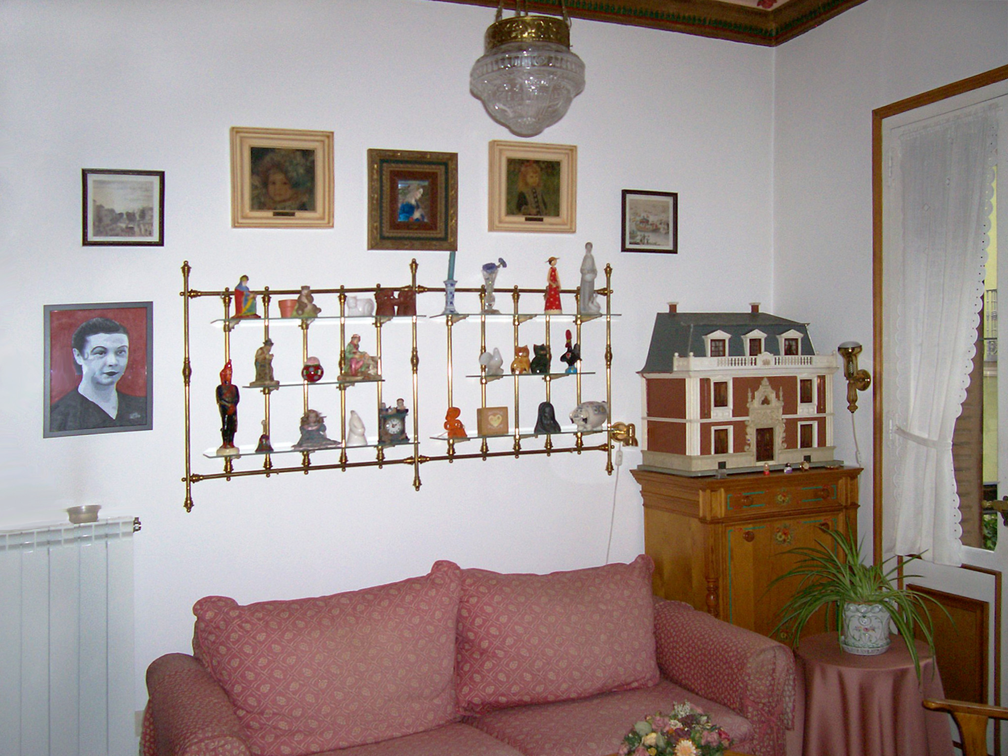 SALÓN. Detalle de la estantería, con los barrotes dorados de una vieja cama, cuadros y casa de muñecas