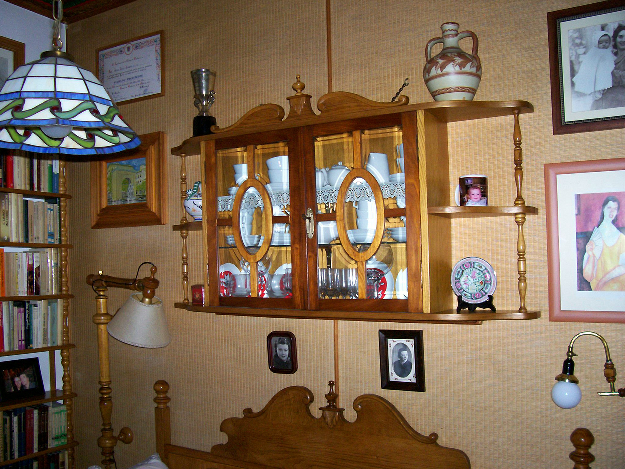 SALÓN. Detalle de la alacena de colgar. La idea surgió al encontrarme en un contenedor un aparador desvencijado. Las puertas de cristales biselados y los torneados de la lámpara fueron lo único recuperable