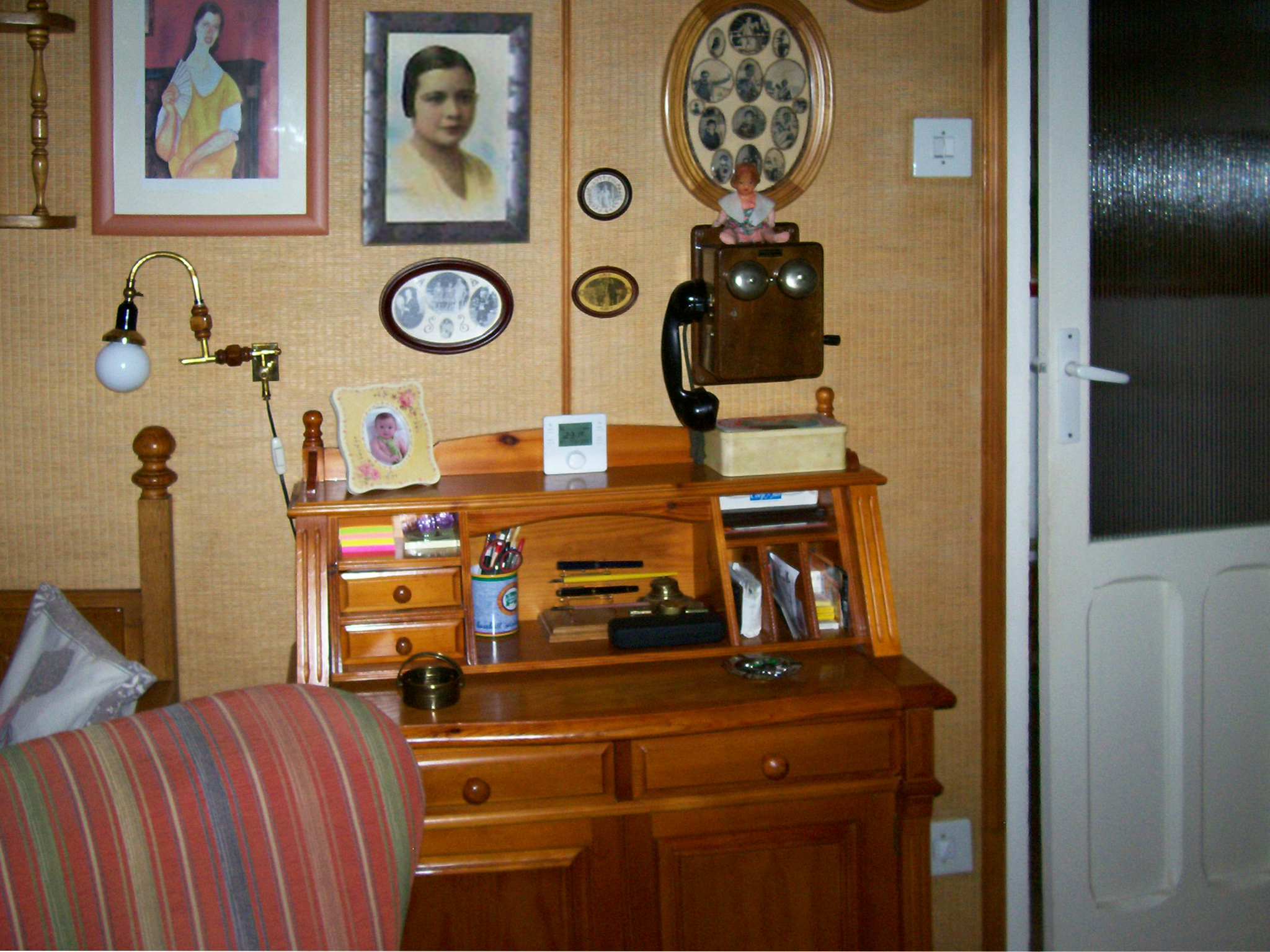 SALÓN. Detalle del escritorio, que es comprado; no, la lámpara, montada con elementos varios. El teléfono es auténtico de época