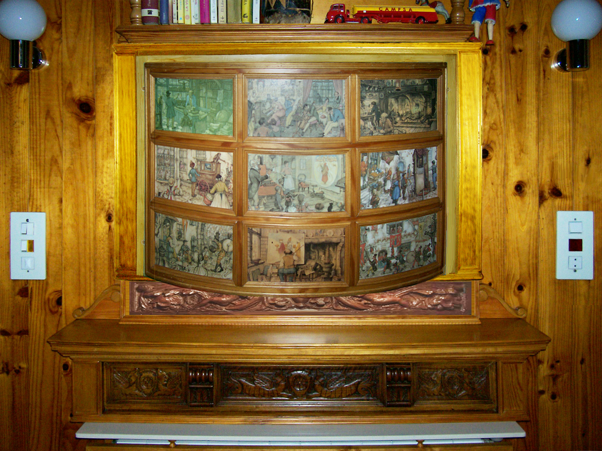 SALÓN. El hueco para la televisión se ha ido modificando a lo largo de los años, de acuerdo con las medidas de la varias que hemos ido teniendo. Y las primeras con un invento muy especial, una plataforma giratoria en una ventana practicada en la pared, para poder verla en el salón y en un dormitorio. La instalación eléctrica era fija, empotrada, con mando en el salón y en la cabecera de la cama. Evidentemente, sólo servía para el encendido y apagado. En la trasera del televisor iba un cuadro, que ocultaba todo el tinglado y aparecía en una u otra dependencia. En la fotografía, detalle del último cuadro que hubo
