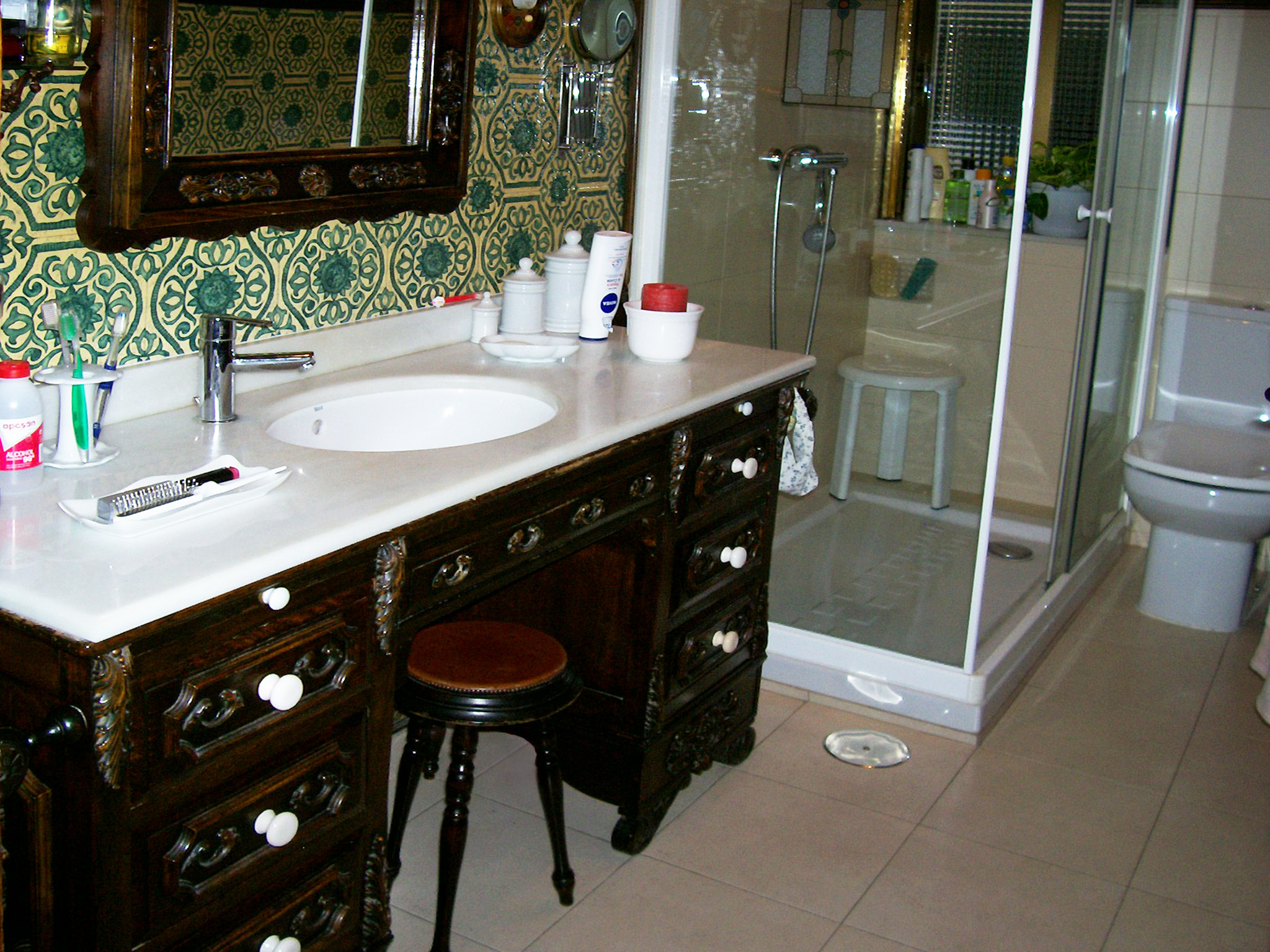 CUARTO DE BAŅO. Detalle del lavabo (la base es una antigua mesa de despacho) y de la ducha