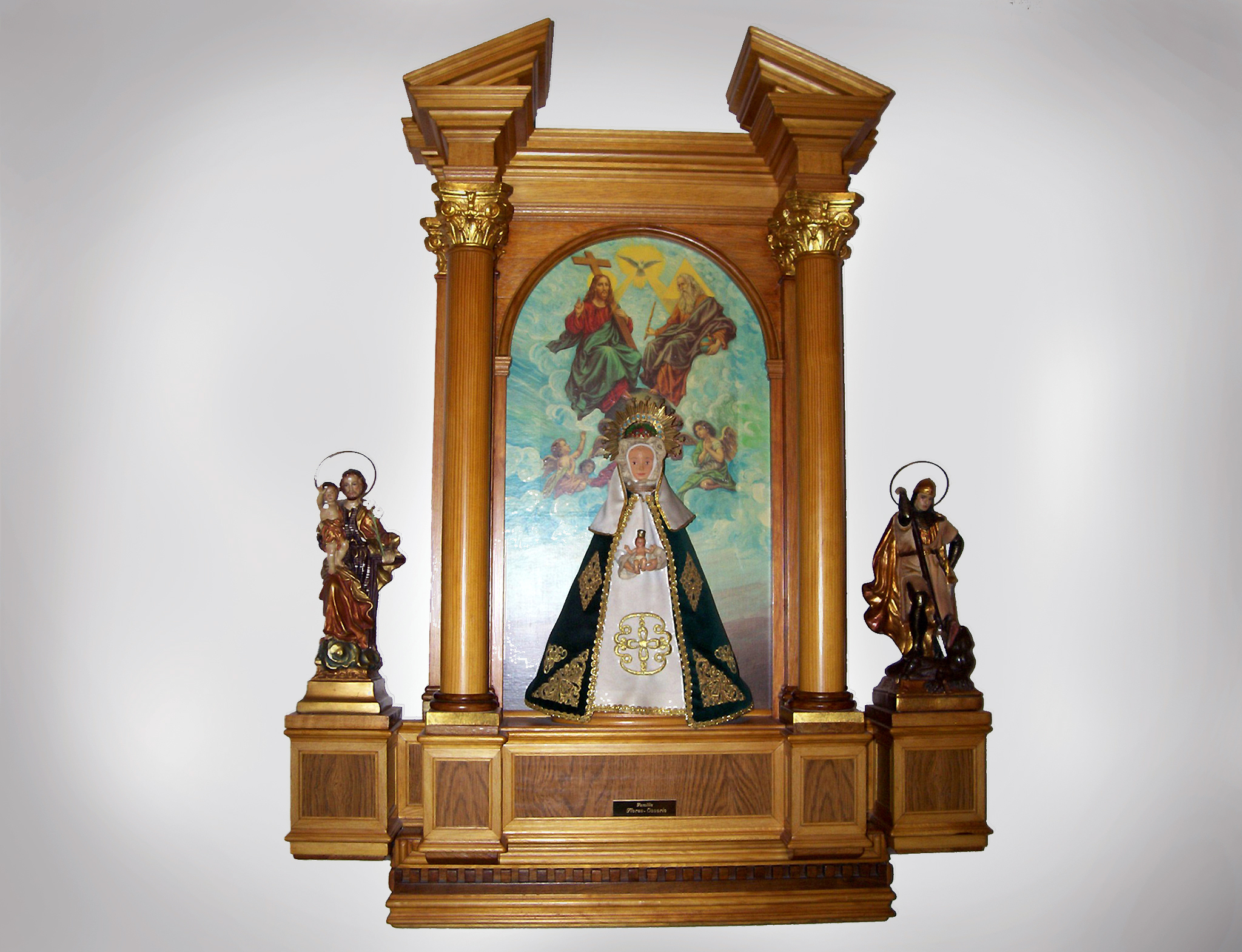 PASILLO. Detalle de un retablillo a manera de capillita familiar, con la Santísima Trinidad, Ntra. Sra. de las Maravillas, San José y San Jorge. Totalmente artesano, es un copia que hice imitando el retablo del altar mayor de la Iglesia de las Maravillas.
