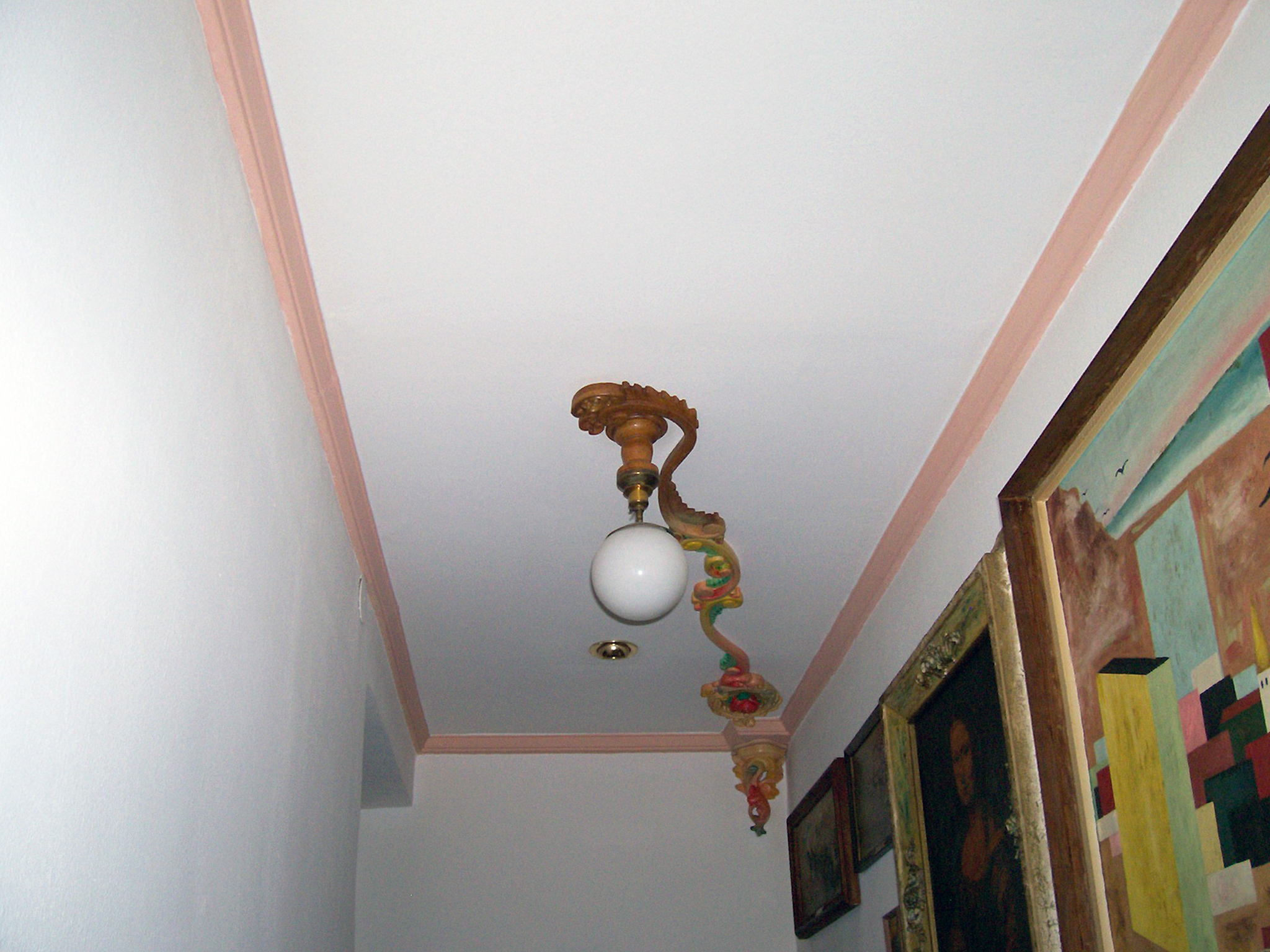 PASILLO. Detalle del techo. La lámpara la realicé con diseño propio en un estilo que bebe en fuentes barrocas y de art nouveau. La idea surgió para tratar de ocultar una viga de hierro que sobresalía del muro. Había que hacerlo de una manera artística