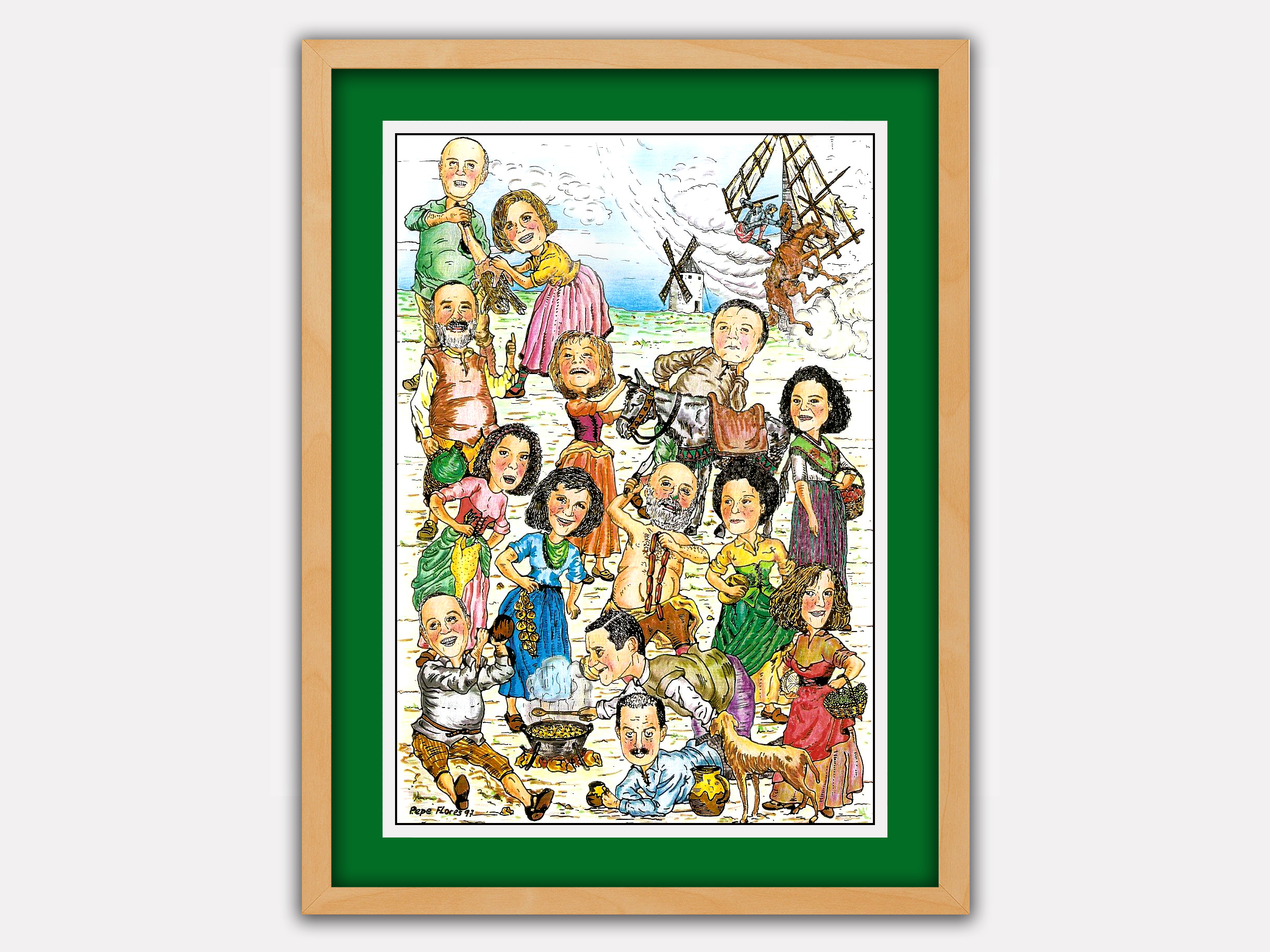 SALÓN. Detalle de la caricatura de mis amigos. Lo somos desde que teníamos los diez años, y algunos incluso desde los tres o los cuatro. Los derroteros de la vida nos han llevado a vivir en Madrid, pero eso no ha impedido que sigamos unidos. Estamos en una idílica comida campestre en la Sierra de los Molinos, en plan manchego, sin emparejar y todos revueltos: Paco Valera, arriba, ayudando a despellicar un conejo, y su mujer Prado, la del canasto con tomates; Rafael García-Casarrubios, el de la garrafa de vino, y su mujer Fini, con una ristra de ajos; José María García-Casarrubios, junto al burro, y Mari, con un cesto de uvas y un queso; Santiago Sánchez-Manjavacas, descamisado y con los chorizos, y Alicia, sujetando al burro; Luis Pedro Perucho, con la bota de vino, y Juani con el conejo; Manolo Marcos-Alberca (Bachito), que vive en Criptana, enredando en la comida, y María Dolores, con una hogaza de pan; y yo mismo, Pepe Flores, con una jarra de vino, y mi mujer Trini Ossorio con un pollo. Desgraciadamente, ya tenemos desaparecidos.